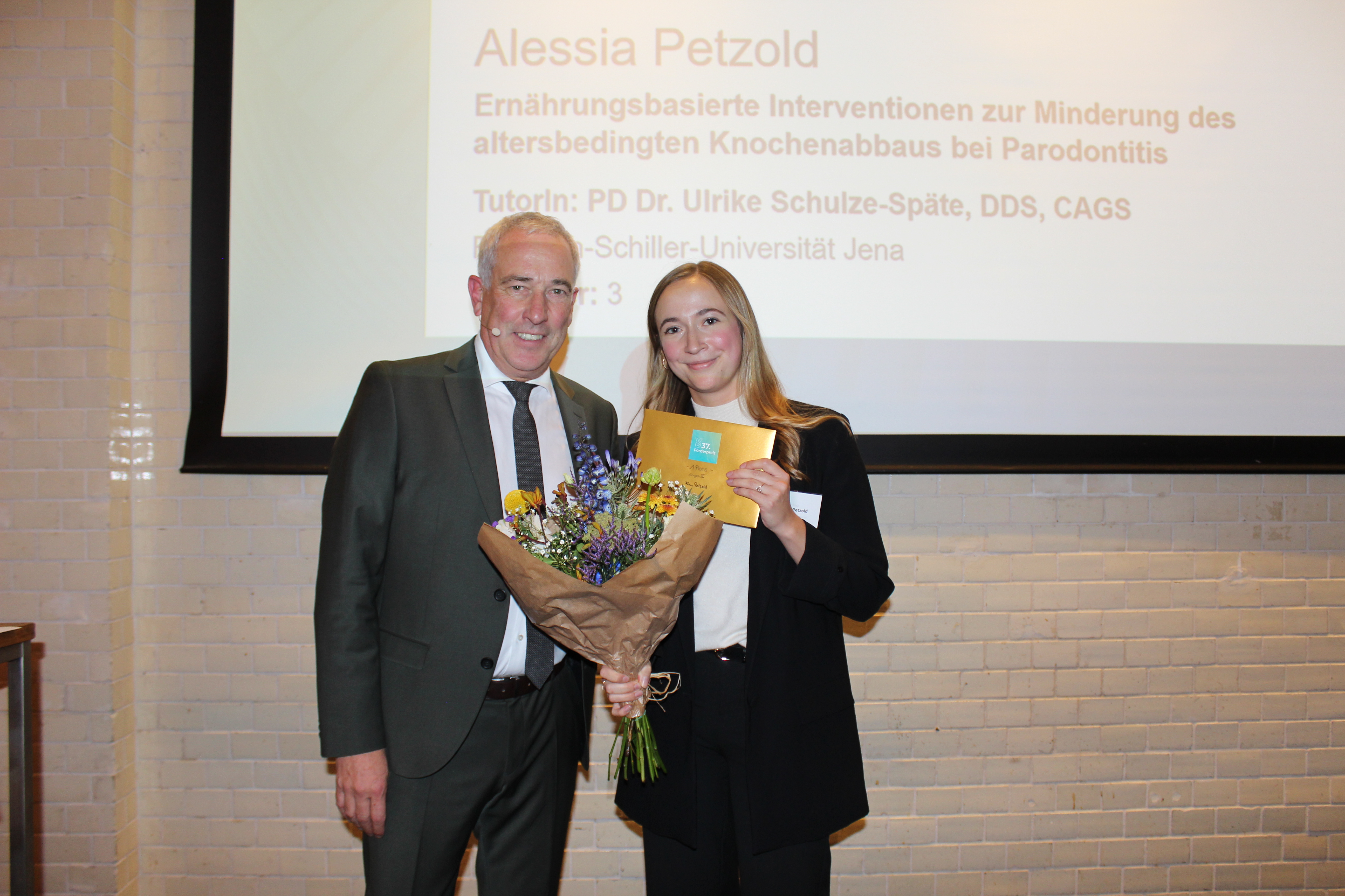 Den ersten Platz in der Kategorie „Grundlagenforschung und Naturwissenschaften“ sicherte sich Zahnärztin Alessia Petzold. Ihre Dissertation „Ernährungsbasierte Interventionen zur Minderung des altersbedingten Knochenabbaus bei Parodontitis“ wurde von Priv.-Doz. Dr. Ulrike Schulze-Späte, Leiterin der Sektion Alterszahnmedizin an der Poliklinik für Konservierende Zahnheilkunde und Parodontologie des Universitätsklinikums Jena, betreut.