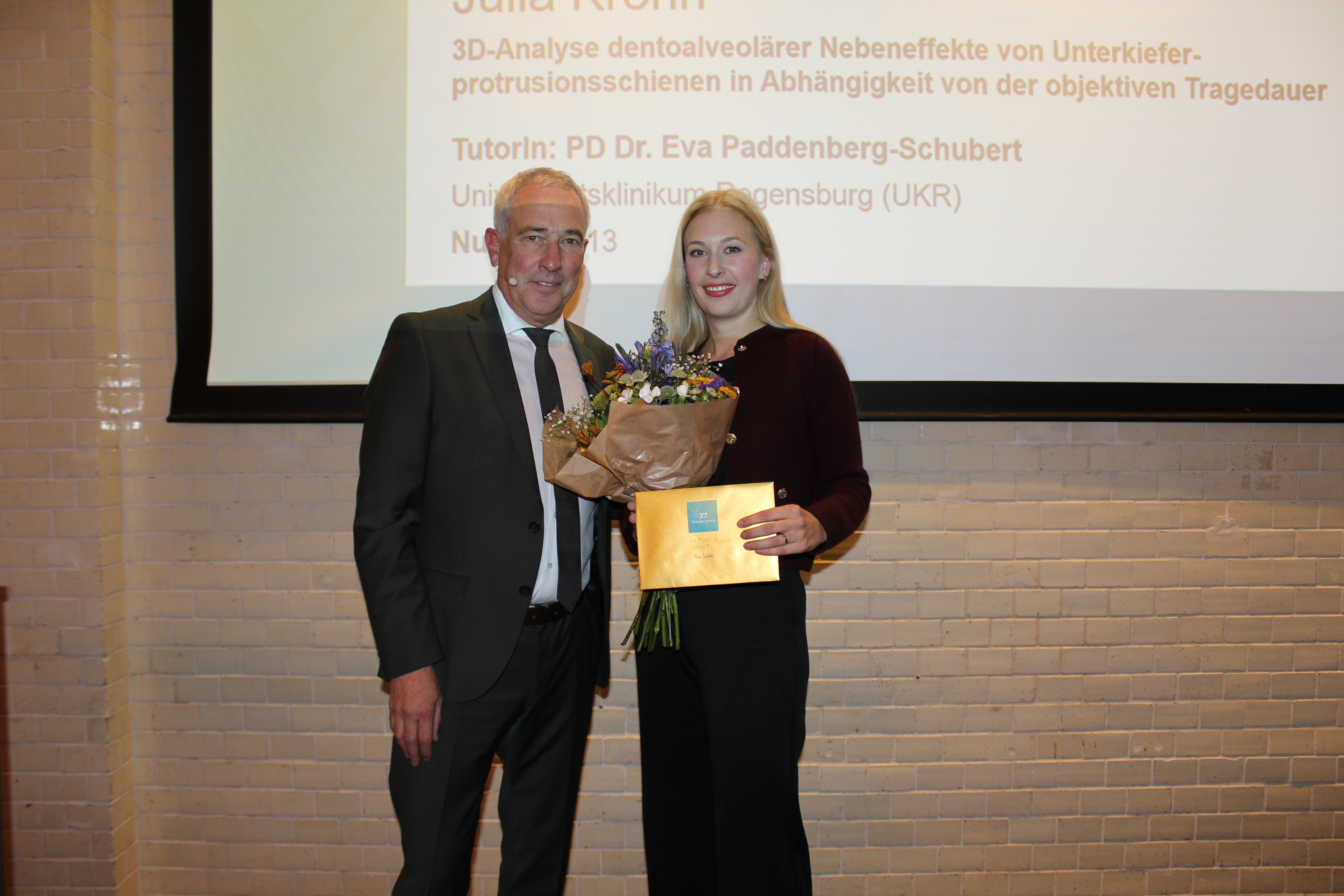 In der Kategorie „klinische Studien, experimentelle Forschung mit unmittelbarem klinischem Bezug, Public Health und Versorgungsforschung“ ging der erste Preis an Zahnärztin Julia Krohn. Ihre Arbeit „3D-Analyse dentoalveolärer Nebeneffekte von Unterkieferprotrusionsschienen in Abhängigkeit von der objektiven Tragedauer“ überzeugte die Jury. Krohn ist in der Poliklinik für Kieferorthopädie des Universitätsklinikums Regensburg tätig; betreut wurde sie von Priv.-Doz. Dr. Eva Paddenberg-Schubert, leitende Oberärztin der Abteilung.