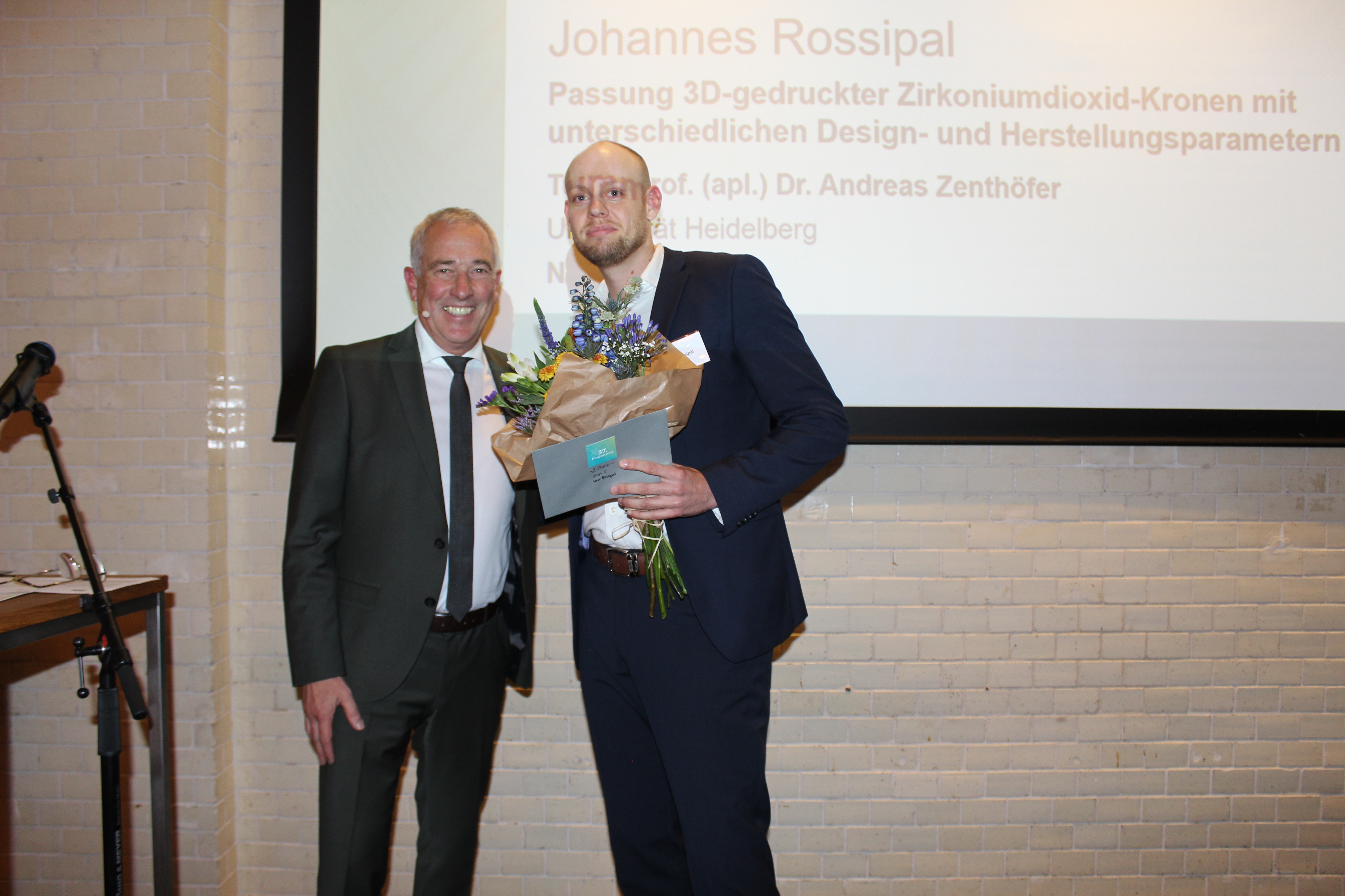 Der zweite Preis in der Kategorie „klinische Studien, experimentelle Forschung mit unmittelbarem klinischem Bezug, Public Health und Versorgungsforschung“ erhielt Zahnarzt Johannes Rossipal. Seine Dissertation „Passung 3D-gedruckter Zirkoniumdioxid-Kronen mit unterschiedlichen Design- und Herstellungsparametern“ entstand unter der Betreuung von Prof. Dr. Andreas Zenthöfer, Sektionsleiter Biomaterial und Werkstoffkunde an der Poliklinik für Zahnärztliche Prothetik des Universitätsklinikums Heidelberg. Rossipal gewann ein Preisgeld in Höhe von 1.000 Euro.